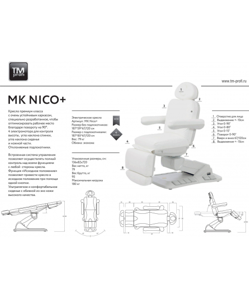 Кушетка косметологическая, кресло "МК145 NIKO TEllA" подходит для массажа и косметологических процедур. Регулировка спинки, высоты, угла наклона и ножной секции осуществляется четырьмя электромоторами с пульта управления, дублирована кнопками на корпусе и педалями в основании, функции исходного положения/ блокировки.